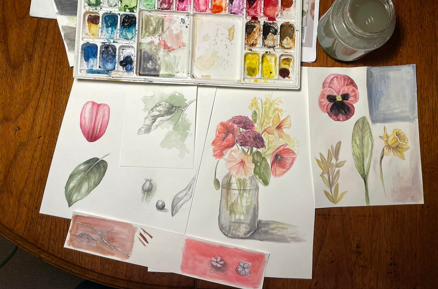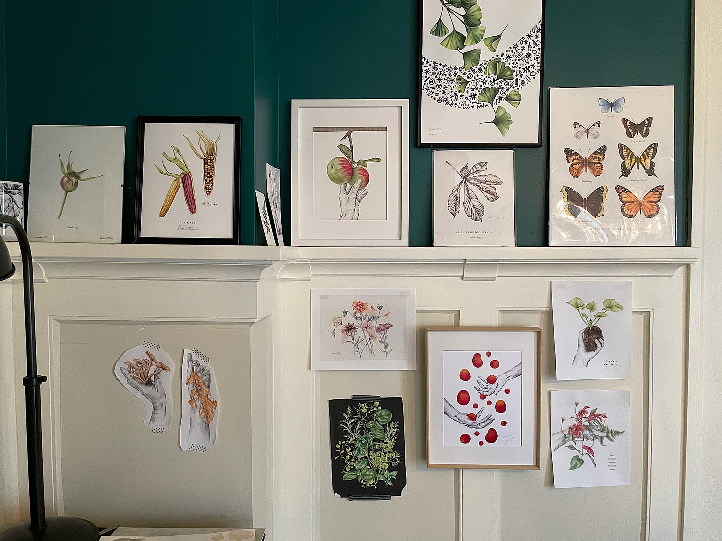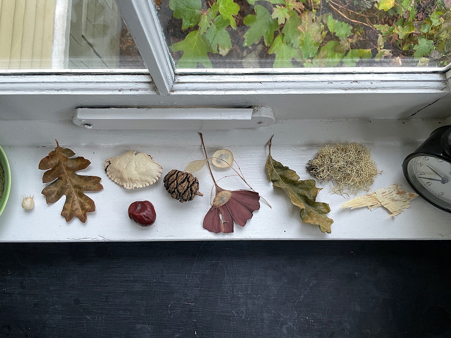 This is how Kristen gathers inspiration: she finds things in the garden or on her walks and puts them on the windowsill, for potential subject matter for future drawings.